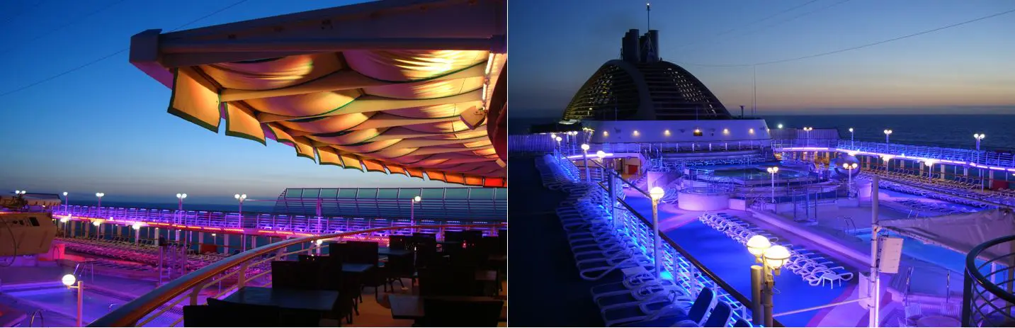 Marine Lighting & entertainment systems on the external decks are one of the greatest sound and lighting challenges on a ship requiring every care and thought in the design process. Weather at sea can be very cruel so knowledge and experience in selecting equipment and its protection is essential. However, it also has to accommodate different functions at any time, ranging from ambient sound and light to an impressive visual system for outdoor events.