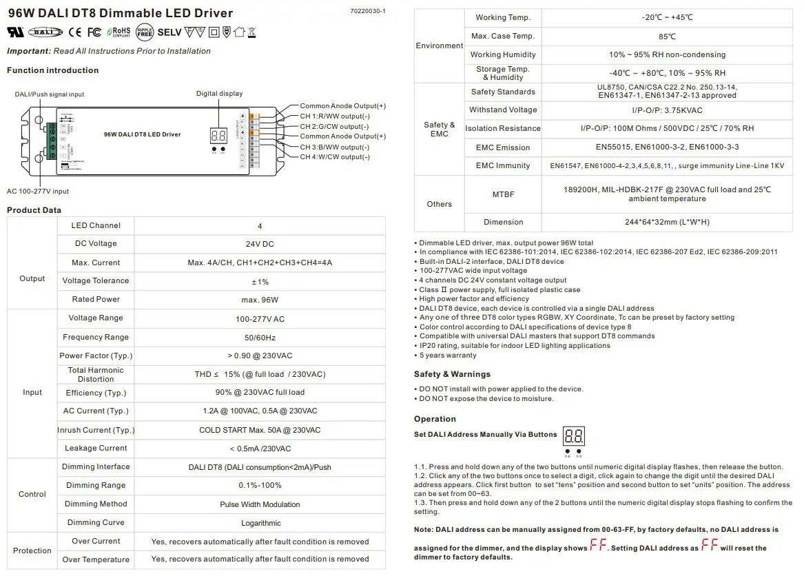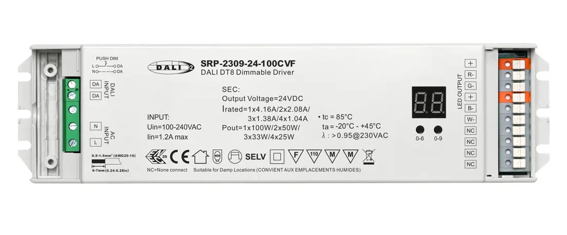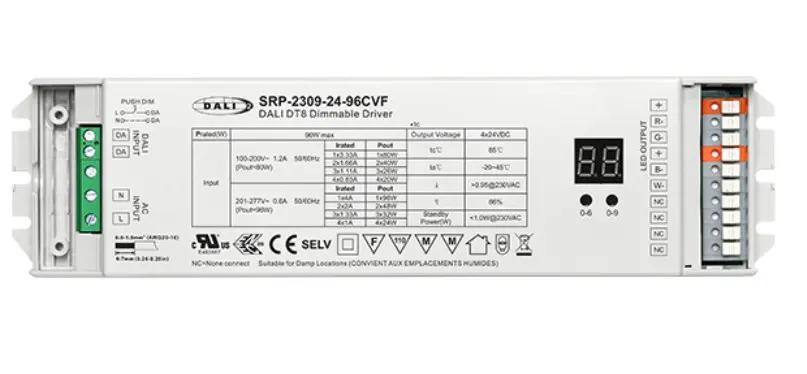 12Volt Or 24Volt – This resolute product is a 96watt dimmable DALI-2 driver with 4 channel constant voltage output. It is designed with 100~277VAC input.