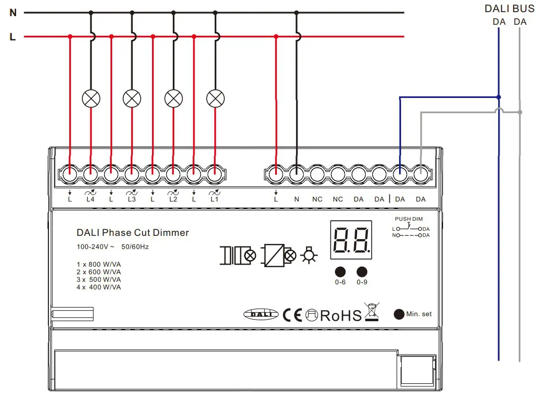 • DALI signal input, DALI address can be set with buttons and displayed on the digital display