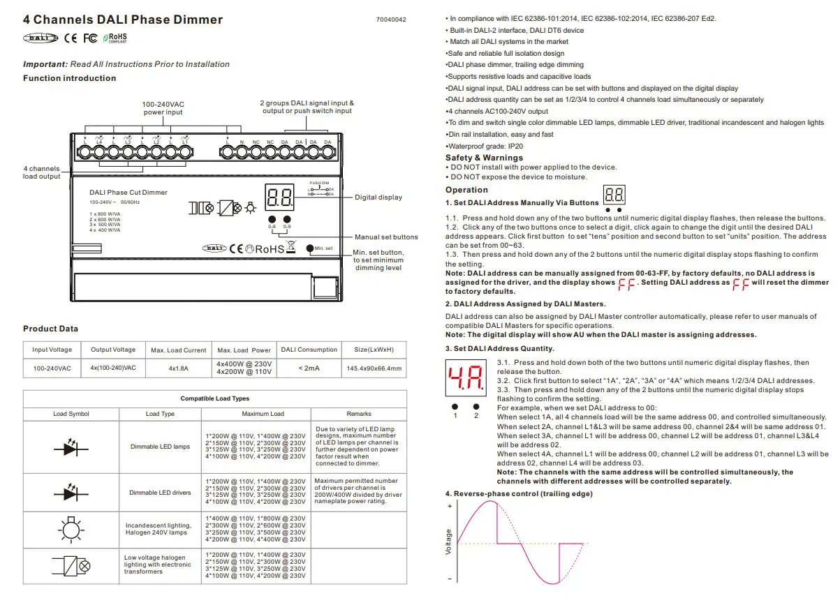 • DALI address quantity can be set as 1/2/3/4 to control 4 channels load simultaneously or separately