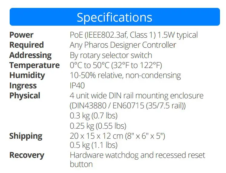 Each device can be placed where it is needed and connected to Pharos Designer Controllers over an Ethernet network. Each RIO has a multi-protocol serial port, supporting DMX output, and a combination of multi-functional digital/analog inputs and relay outputs.