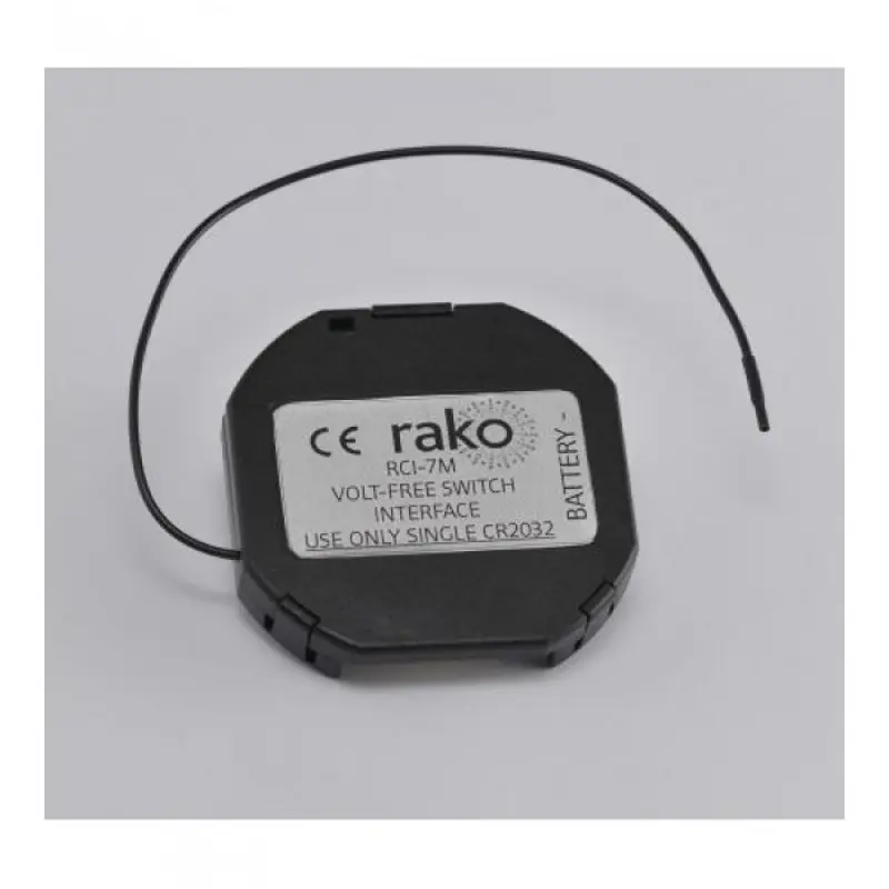 The Rako RCI-7M accepts volt-free momentary switch inputs and transmits wireless Rako coded Rakom messages to other Rako wireless receiver and Bridge units. The module is battery powered and is designed to fit in a standard UK backbox.