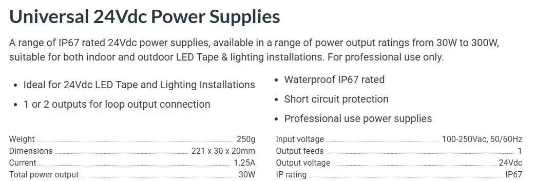 A range of IP67 rated 12Vdc and 24Vdc power supplies, available in a range of power output ratings from 30W to 150W, suitable for both indoor and outdoor LED Tape & lighting installations. For professional use only.