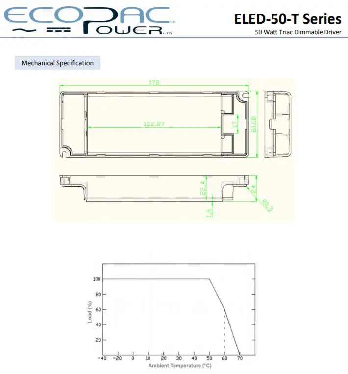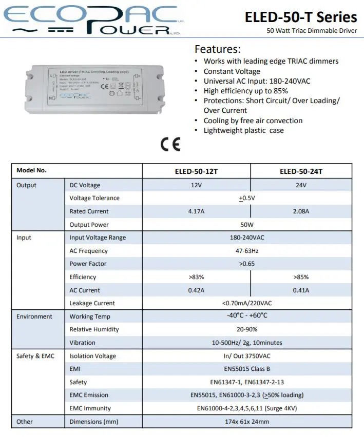 12V 50W / Mains Triac Dimmable Ecopac ELED-50-12T Constant Voltage LED Driver