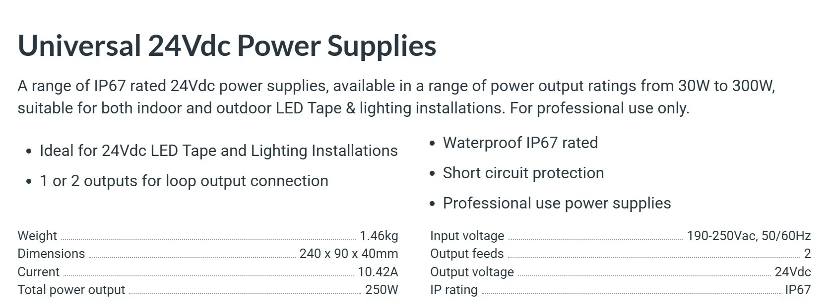 A range of IP67 rated 24Vdc power supplies suitable for both indoor and outdoor LED Tape & lighting installations. For professional use only.