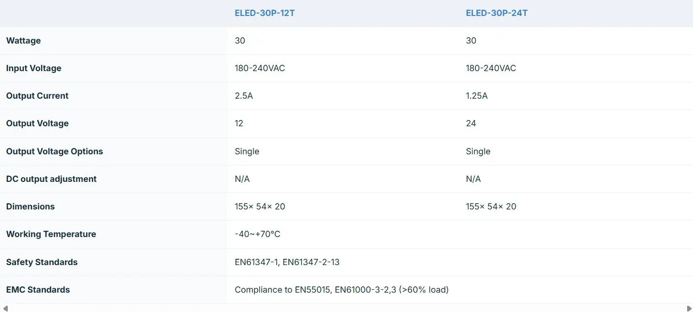 - Output Voltage Options: 12V (ELED-30P-12T) / 24V (ELED-30P-24T)