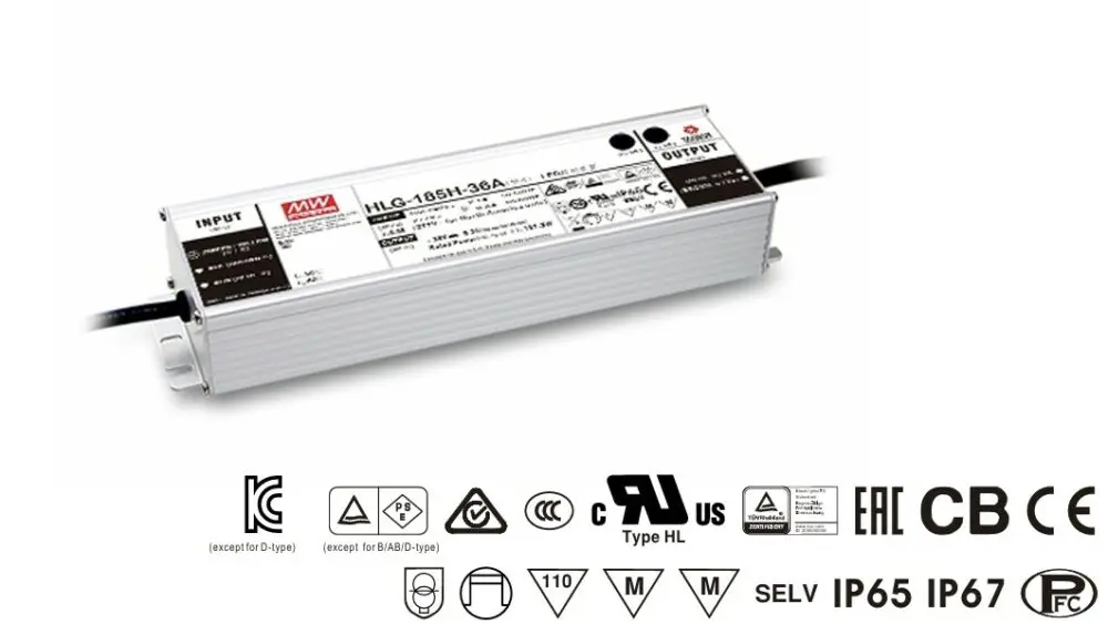 The Mean Well HLG-185H Series is a 185 W dual-mode (CV + CC) LED driver tailored for high-power outdoor LED systems. (Refer to datasheet for detailed variant specs.)