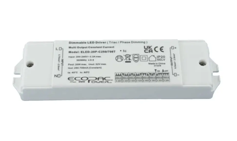 The ELED-20P-C250/700T Series is a 20W constant current LED driver with high-performance TRIAC dimming technology. Designed for architectural, retail, and commercial lighting applications, it provides smooth, silent dimming and consistent current output.