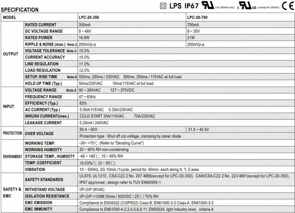 The Mean Well LPC-20 Series is a compact 20 W constant current LED driver engineered for small-scale indoor or outdoor applications. It provides stable current regulation, high efficiency and IP67-rated reliability for LED luminaires and signage.