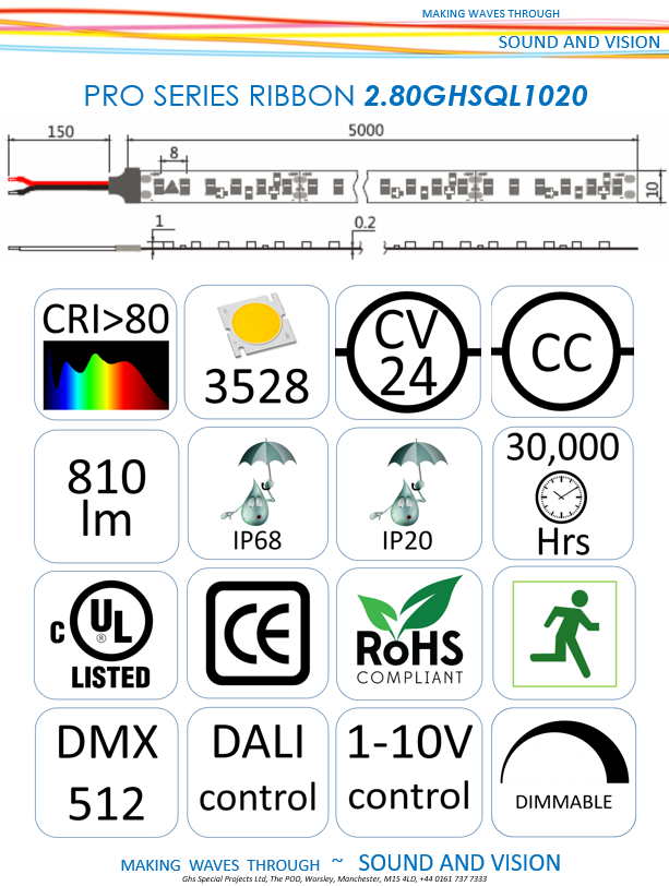 Our new Pro-Series SMD LED ribbon uses the latest Samsung chip technology, Designed for easy installation, it provides a high lumen light with excellent performance and with it’s flexible structure it will light the most challenging projects. A 5 Year warranty is provided when installed according to directions with our heat-sink channel and an LED Surge Protection module (SPM – Supplied FREE on orders over £500)