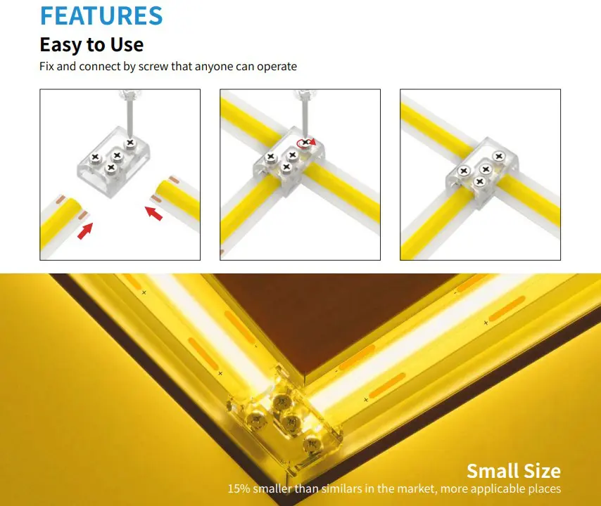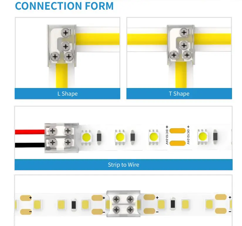 Some connectors are designed specifically for COB (chip-on-board) LED strips, while others work with traditional SMD (surface-mounted device) strips. It’s important to use the correct one for your specific LED strip to ensure a proper connection