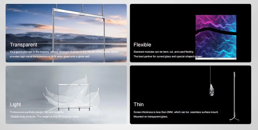 The Holographic LED Screens are designed to transform a wide range of environments with their stunning visuals and versatile functionality. Widely used in commercial window, commercial curtain wall, exhibition hall, creative display, entertainment and tourism, automobile 4S shop and other fields.