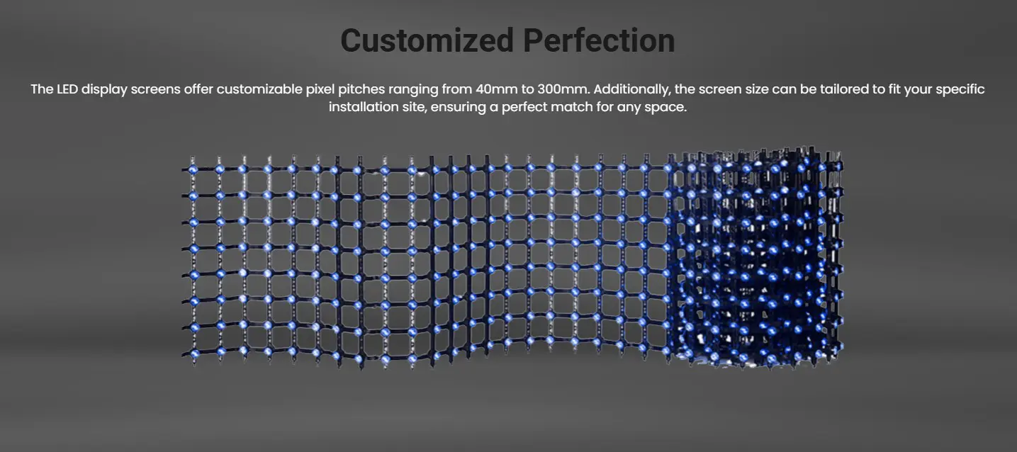 The LED display screens offer customizable pixel pitches ranging from 40mm to 300mm. Additionally, the screen size can be tailored to fit your specific installation site, ensuring a perfect match for any space.