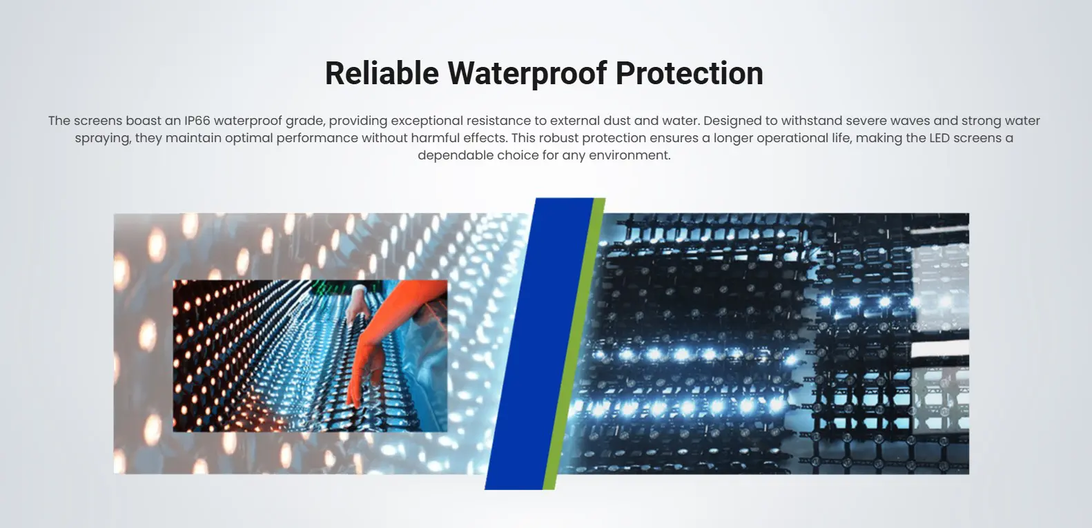 The screens boast an IP66 waterproof grade, providing exceptional resistance to external dust and water. Designed to withstand severe waves and strong water spraying, they maintain optimal performance without harmful effects. This robust protection ensures a longer operational life, making the LED screens a dependable choice for any environment.