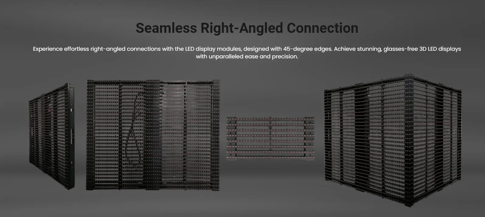Experience effortless right-angled connections with the LED display modules, designed with 45-degree edges. Achieve stunning, glasses-free 3D LED displays with unparalleled ease and precision.