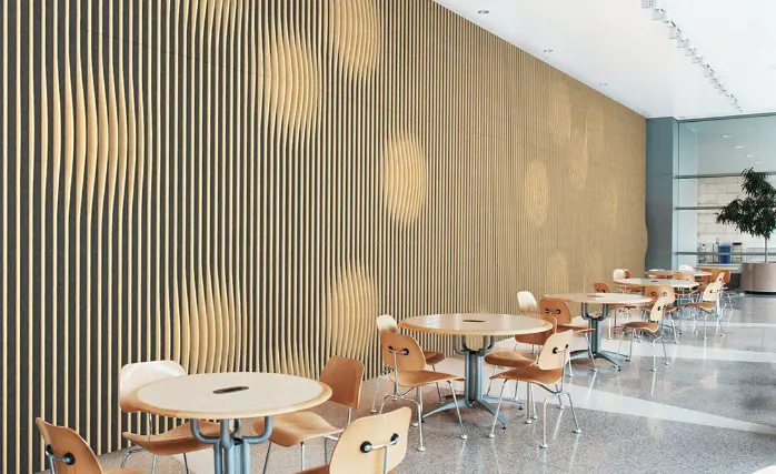 – Avalon – Wave Panelling – Is a parametric hybrid absorber, tying high-performance absorption and diffusion. Creates the perfect wall-to-wall solution and is crafted in a selection of eight different designs for unlimited tailored combinations.